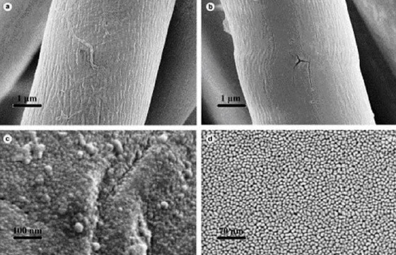 | SEM images of (a) uncoated cotton wool fiber, (b) titania coated cotton wool fiber showing the morphological modify inward the surface structure, (c) higher magnification icon of titania coated cotton wool fiber showing the shape too size of the titania particles, too (d) higher magnification icon of a titania celluloid coated on glass. |
