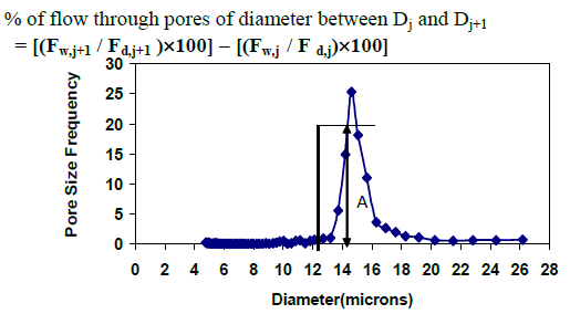 The quantity [(Fw,j / F d,j) × 100] plotted every bit a business office of pore size is designated every bit cumulative filter menstruation yesteryear PMI inwards its study program. Figure xi shows cumulative filter menstruation every bit a business office of pore diameter. For representative this figure shows that 45 % menstruation is through pores having diameter greater than xv microns. [1]