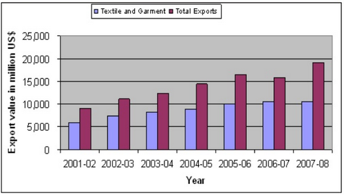 In Textile exports portion total export of Islamic Republic of Pakistan has declined from 67% inwards 1997to 55% inwards 2008, equally exports of other textile sectors grew Textile exports inwards 1999 were $5.2billion in addition to rose to dice $10.5billion past times 2007.
