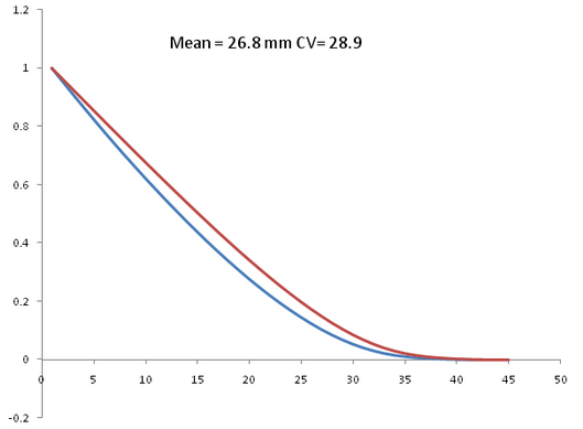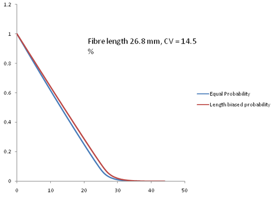 | Fig 4 : Comparison of fibrograms with equal probability for fibres and length biased probability in fibrosampler beard of low variability cotton, Mean length 26.8 mm, CV = 14.5 % % |