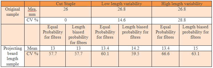 Belmasrour38 et al proposed a method for estimating fibre length distribution of a sample from length distribution of fibres projecting from the comb of fibrograph. Predicted curve gives good agreement with experimental except in short fibre region. CV of fibre length for the projecting fibre sample (from the fibrograph comb) was calculated for constant staple length, low and high length variability original samples are given in Table 5. CV of fibre length is as high as 57.7 % for cut staple and increases marginally to 60 % in low variability sample and to 66% in high variability sample. High variability in beard sample is because of random clamping of fibre which is akin to random breakage of fibre. Variability of fibre length in original sample has only a marginal effect on variability in beard sample. Beard sample with length biased picking has a lower variability than equal probability picking.