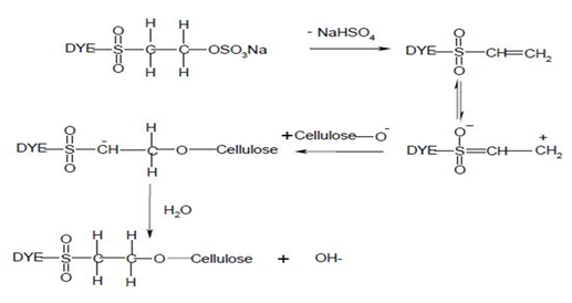 Nucleophilic addition characterizes the dye-fiber reaction in which a nucleophilic group in the fiber adds across an activated carbon-carbon double bond in the reactive group. Most of reactive systems used contain a vinylsulphone moiety. The vinylsulphone reactive group itself is usually not present in commercial form of the dyes employed. Instead, more stable precursor such as the β-sulphatoethylsulphone group is used. The two-stagenprocess associated with fiber fixation is structurally related dyes containing a β-sulphatoethylsulphamoyl group probably form a cyclic compound capable of reacting with cellulose to give cellulose ether.