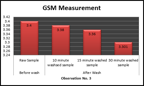Bleach washing increases the weight loss% of woven denim apparels. We know damage % should not be more than 30%, All of the tests are remain within the limit. More difference in observation 2, the weight loss% is (3.5-3.29)/3.5 ˟100= 6%. It has been explored that due to long time washing the weight loss % is increased.